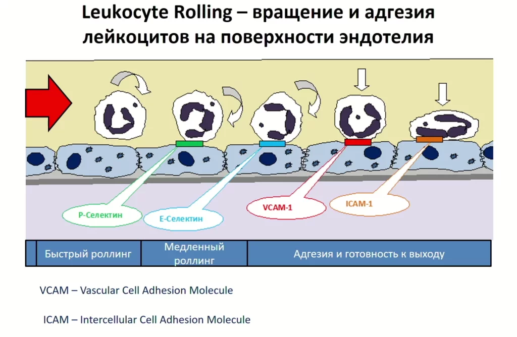 На мембране поверхность лейкоцита должна считывать иммунную информацию, чтобы отреагировать адекватно на “вторжение чужих”, если говорить так простым языком. И сначала надо их раскрутить, чтобы они покатились по эндотелию, а в нужных местах их надо затормозить. Все аббревиатуры, которые заканчиваются на CAM - это Cell Adhesion Molecules.