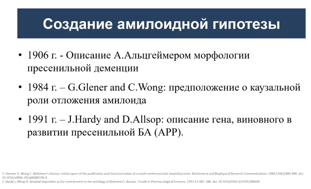 Таким образом впервые описал изменения в мозге А.Альцгеймер, а предположения о каузальной (причинной) роли амилоида высказали Гленнер и Вонг, и их буквально высмеяло международное научное сообщество, никто им не поверил.
