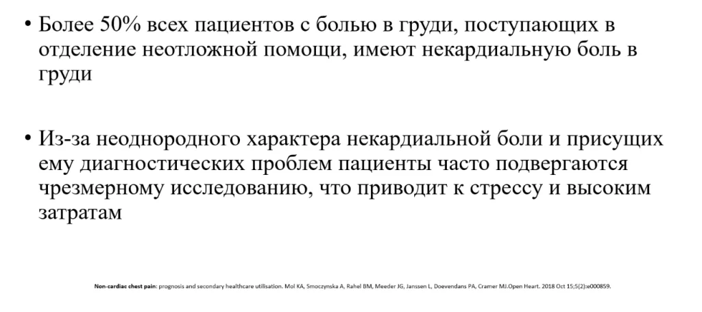 50% всех пациентов с болью в груди, которые поступают в отделение неотложной помощи имеют некардиальную боль в груди, то есть у них нет сердечной патологии.