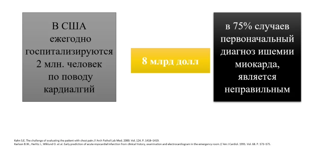 Ежегодно в США госпитализируются 2 млн человек по поводу кардиалгии, и в 75% случаев первоначальный диагноз “ишемия миокарда” не подтверждается. И дальше стоит вопрос, что делать с этим пациентом, какой дифференциальный диагноз.