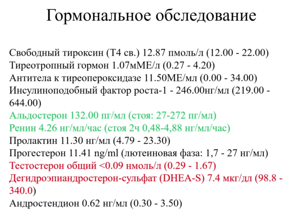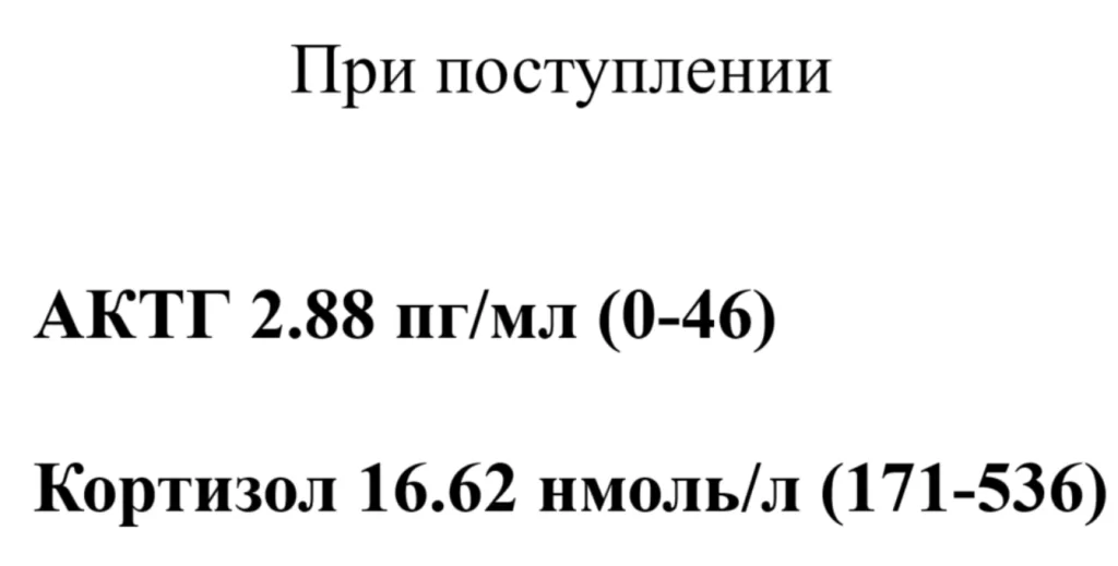 Динамика уровня адренокортикотропного гормона не укладывалась в представление первичной отплоченниковой недостаточности поэтому пациентка была направлена в отделение эндокринологии для того, чтобы понять это первичная или вторичная недостаточность. Потому что этот уровень адренокортикотропного гормона более характерен для вторичного почечной недостаточности.