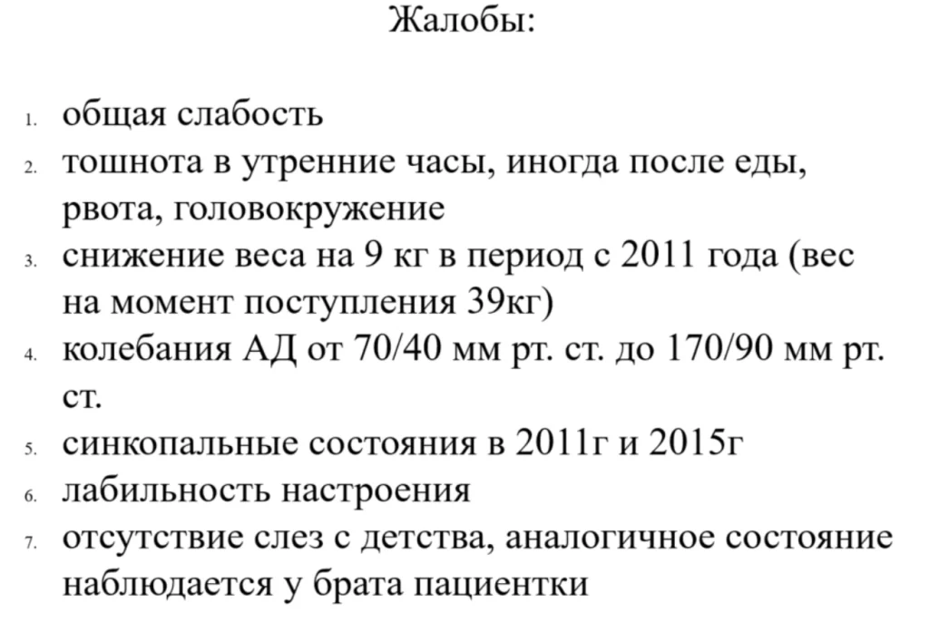 Основная жалоба — снижение массы тела. На момент поступления вес составлял 39 кг при среднем росте 165 сантиметров.