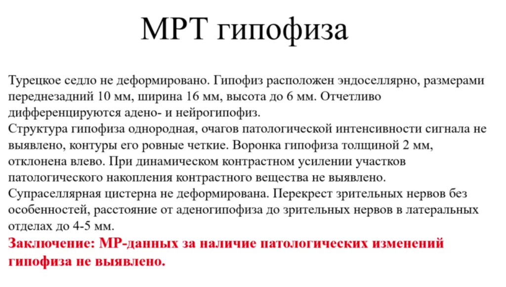 Выше представлено описание, но заключение довольно короткое - никаких патологических изменений гипофиза не выявлено.