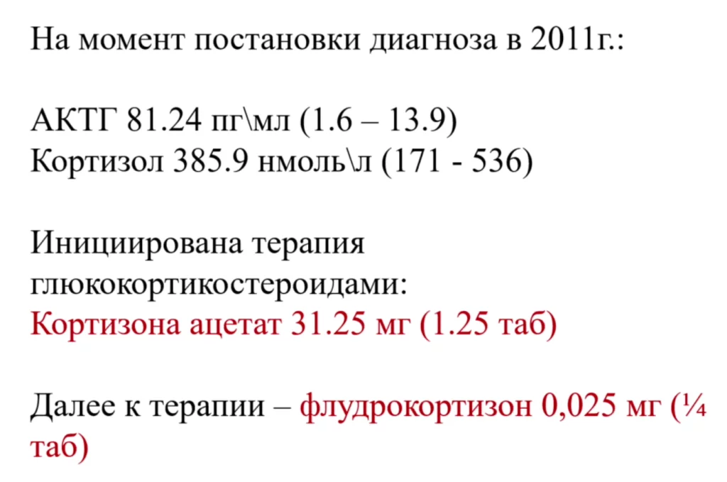 На момент постановки диагноза в 2011 году на основании клинической картины и значительного повышения уровня адренокортикотропного гормона, был установлен диагноз первичной надпочечниковой недостаточности.