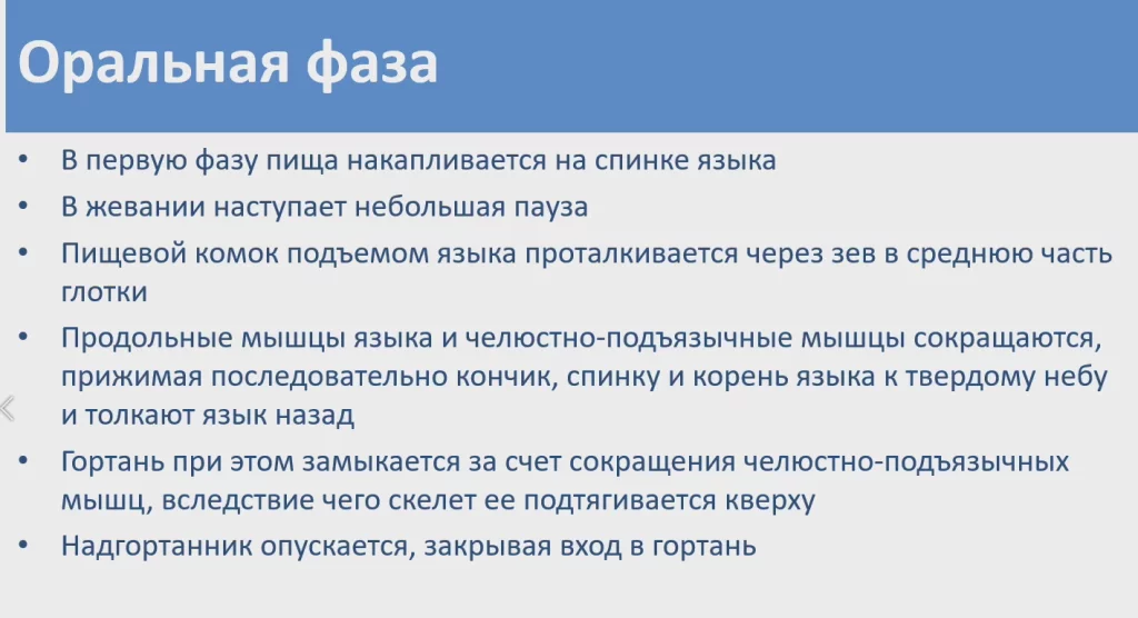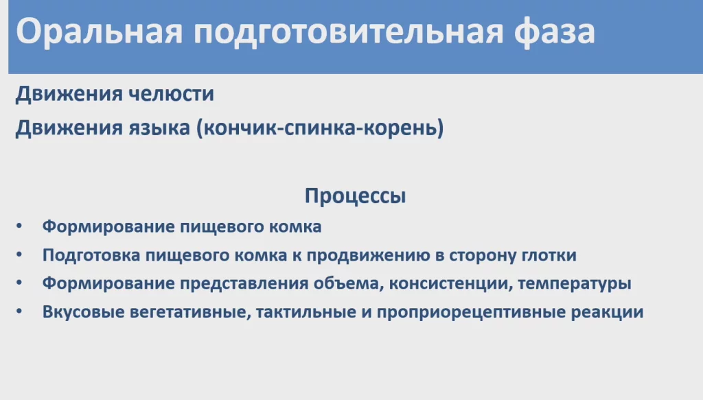 Оральная подготовительная фаза — движение челюсти, движение языка.