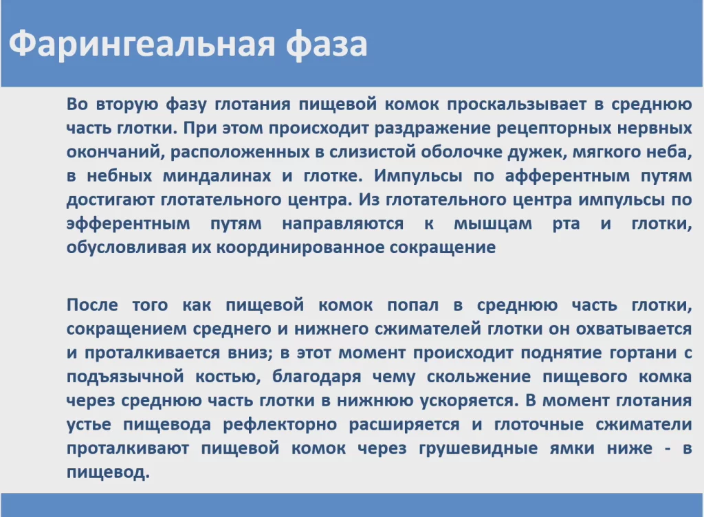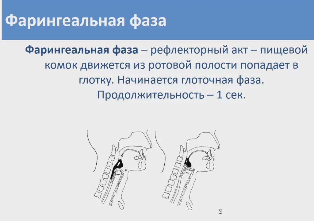 Фарингеальная фаза — рефлекторный акт - пищевой комок движется из ротовой полости, попадает в глотку, начинается глоточная фаза, продолжительность которой очень маленькая - не должна превышать одной секунды.