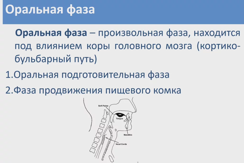 Оральная фаза произвольная, находится под влиянием коры головного мозга и в ее реализации участвует так называемый кортико-бульбарный путь.