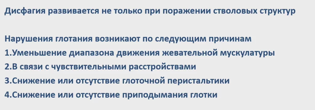 Дисфагия развивается не только при поражении стволовых структур, она может развиваться при: