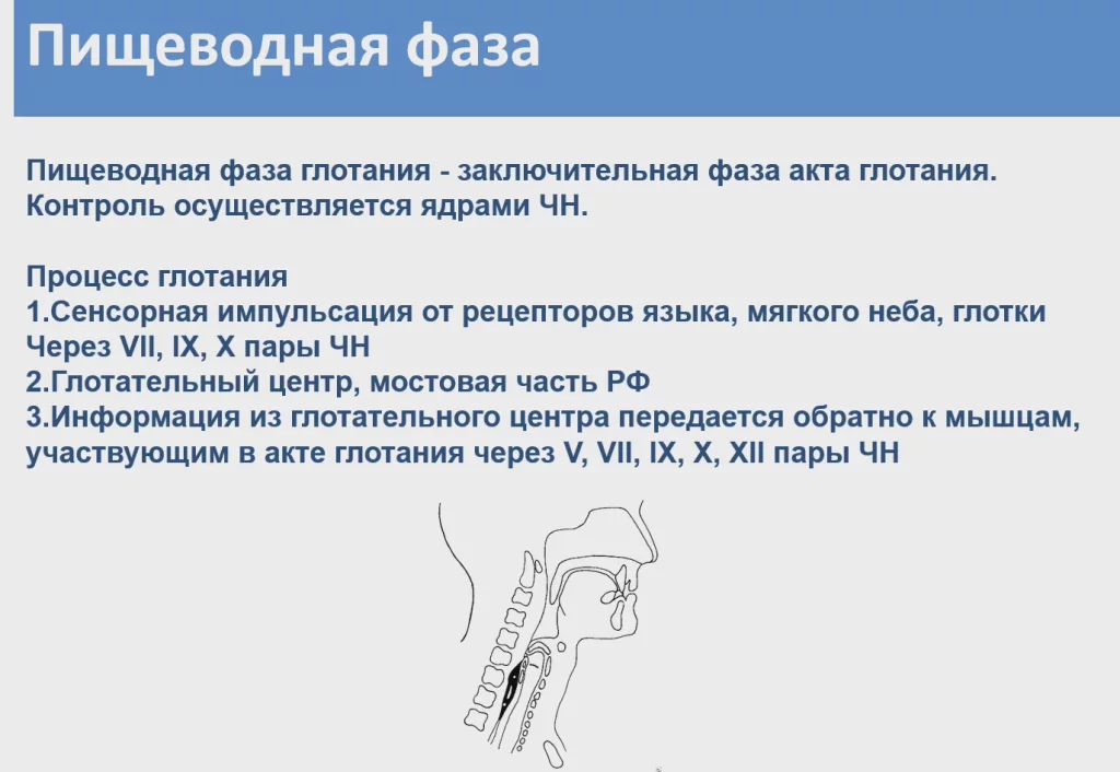 Пищеводная фаза глотания - заключительная. Контроль осуществляется ядрами черепных нервов. Процесс глотания- это сенсорная импульсация от рецепторов языка мягкого неба глотки через седьмую, девятую и десятые пары черепных нервов.