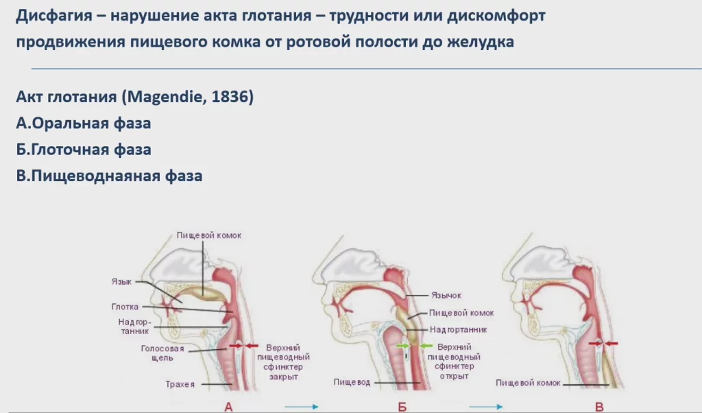 Важно! Дисфагия может развиваться при нарушениях на любой из фаз глотания.