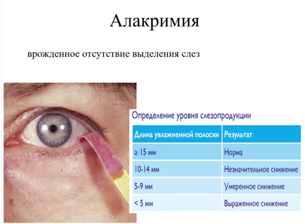 Специальная полоска закладывается за нижнее веко и по длине увлажненной полоски определяют имеются ли патологии.