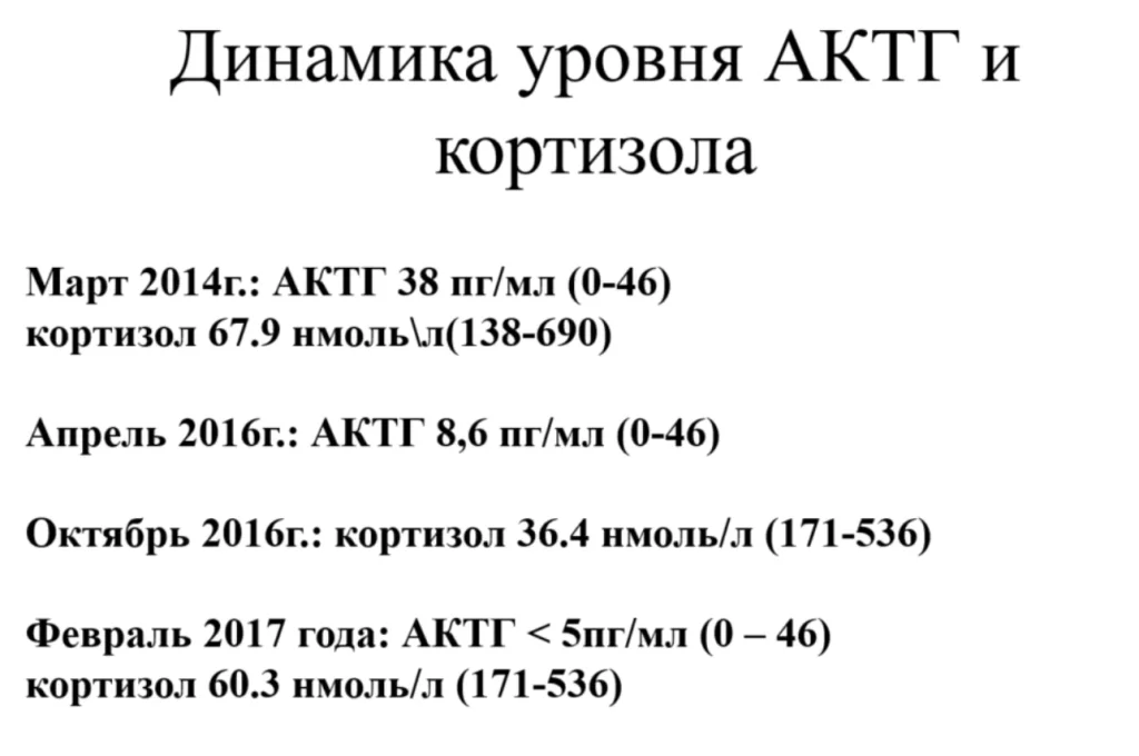 Уровень кортизола в крови оставался в пределах низко нормальных значений. На рисунке выше видно, что на момент выявления диагноза у пациентки довольно высокий уровень адренокортикотропного гормона, но при этом кортизол не критически низкий.