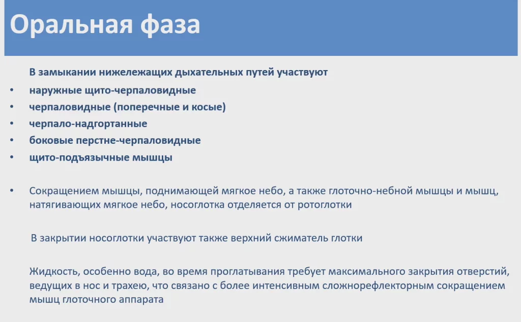 Оральная фаза произвольная, находится под влиянием коры головного мозга и в ее реализации участвует так называемый кортико-бульбарный путь.